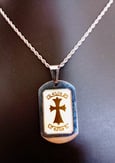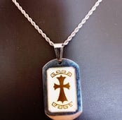 Colar em cordão tipo corrente em aço inoxidável 316 L, com pingente de Jesus crucificado retangular.